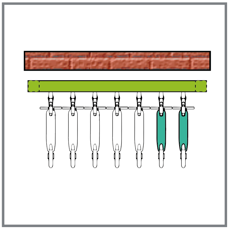 La stessa stazione di parcheggio e ricarica di monopattini elettrici può gestire 5 parcheggi tutti sullo stesso lato, oppure 10 in tutto con 5 parcheggi su un lato e 5 in quello opposto. Nel caso del MultiParkie 5 la rastrelliera va collocata parallelamente al muro e l'accesso dei veicoli avviene frontalmente, nel caso del MultiParkie 10 invece la rastrelliera va posta perpendicolarmente al muro oppure in un open-space, e l'accesso dei veicoli avviene lateralmente. Per questa soluzione bisogna calcolare bene lo spazio che c'è a disposizione. Per le E-Bike ci sono soluzioni da 4-5-7-9 posteggi e vale lo stesso ragionamento dei monopattini.