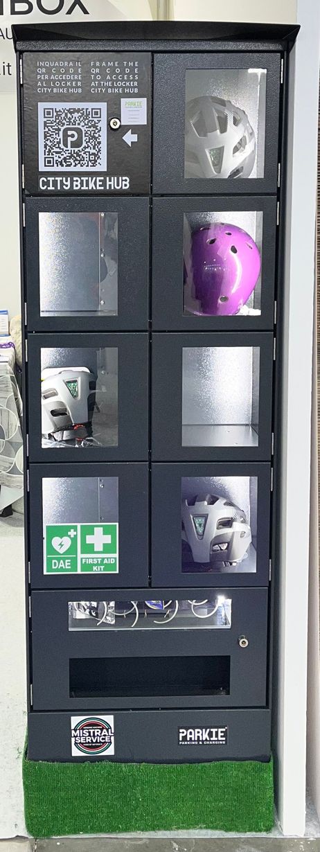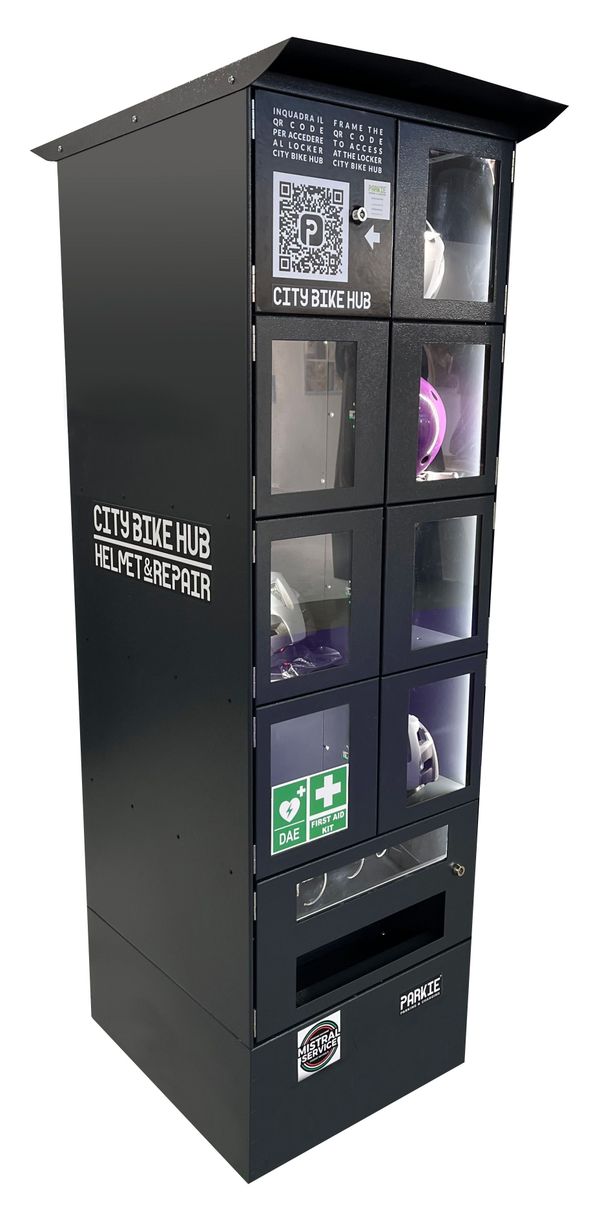 Trovi tutto a disposizione presso la STAZIONE DI RICARICA Parkie, dal sistema di CHIUSURA a quello di RICARICA. E da oggi puoi anche noleggiare un caschetto con l'innovativo locker CITY BIKE HUB, indispensabile per il servizio sharing ed utilissimo per i servizi integrati (per Hotel, Università, Aziende).