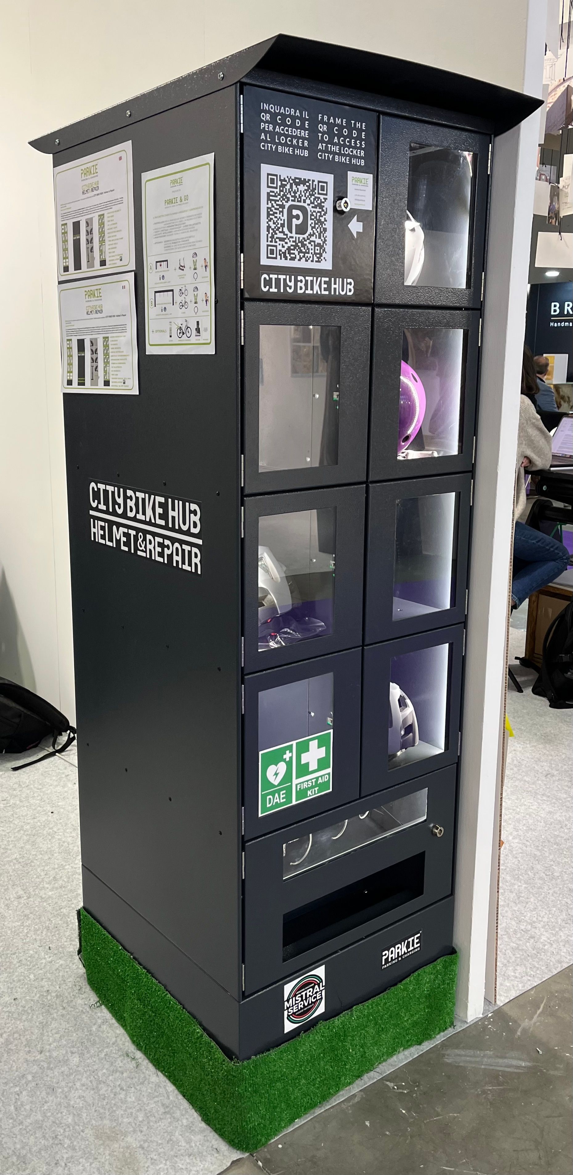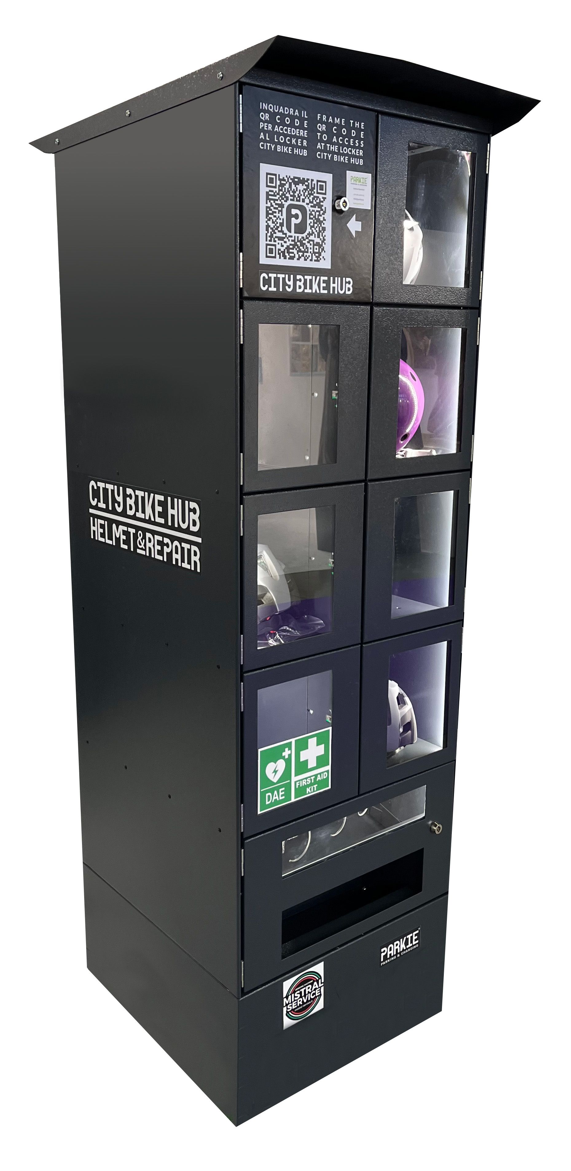 Trovi tutto a disposizione sulla STAZIONE DI RICARICA Parkie, dal sistema di CHIUSURA a quello di RICARICA. E da oggi puoi anche noleggiare un caschetto con l'innovativo locker CITY BIKE HUB, indispensabile per il servizio sharing ed utilissimo per i servizi integrati (per Hotel, Università, Aziende).