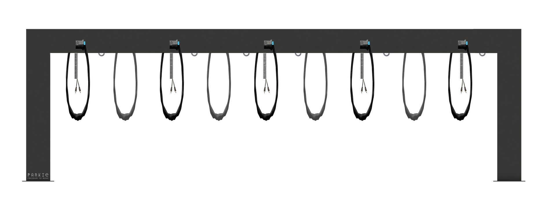 La stessa stazione di parcheggio e ricarica di monopattini elettrici può gestire 5 parcheggi tutti sullo stesso lato, oppure 10 in tutto con 5 parcheggi su un lato e 5 in quello opposto. Nel caso del MultiParkie 5 la rastrelliera va collocata parallelamente al muro e l'accesso dei veicoli avviene frontalmente, nel caso del MultiParkie 10 invece la rastrelliera va posta perpendicolarmente al muro oppure in un open-space, e l'accesso dei veicoli avviene lateralmente. Per questa soluzione bisogna calcolare bene lo spazio che c'è a disposizione. Per le E-Bike ci sono soluzioni da 4-5-7-9 posteggi e vale lo stesso ragionamento dei monopattini.